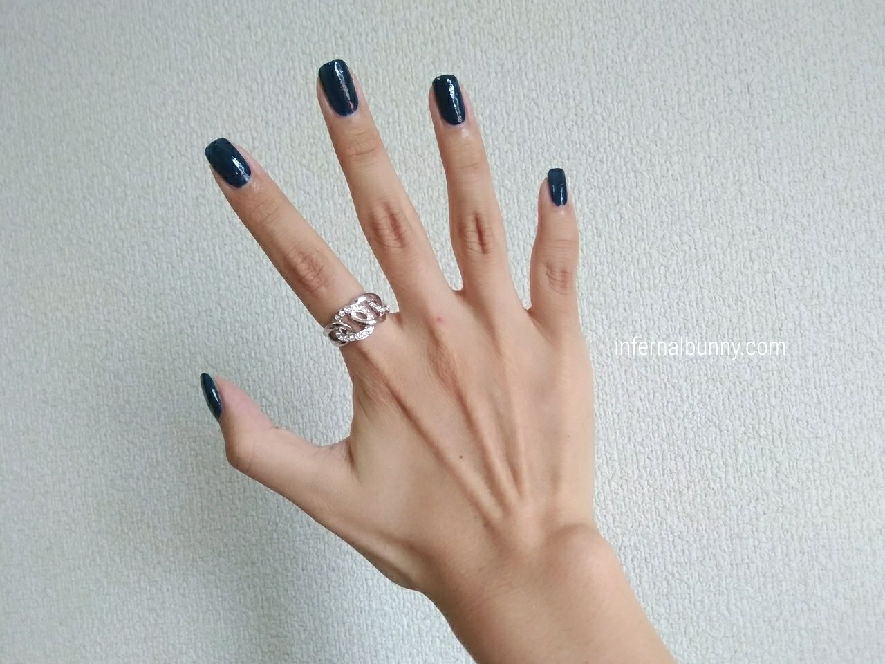 ややくすみのあるディープブルー。紫味はないので、ネイビーというよりはディープブルーと呼びたいところだ。一度塗りでも高発色。写真は二度塗り。