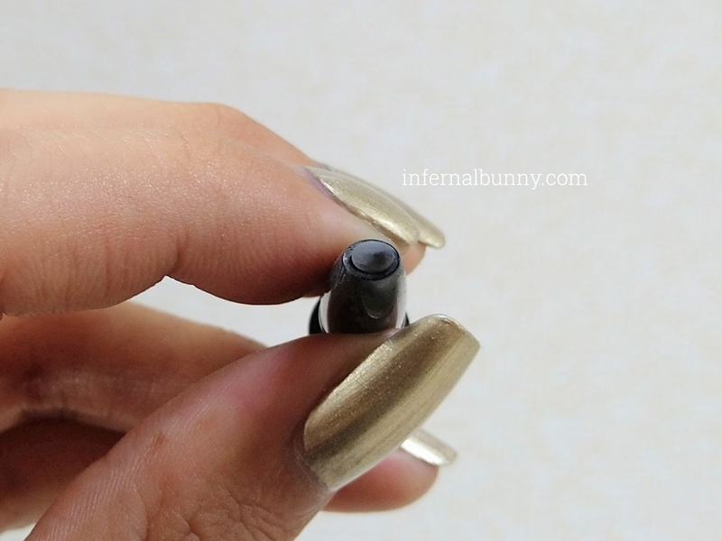 ペン先は固形で、細くて丸いタイプです(写真は使っているうちに斜めに削れています)。繰り出し式で、自由に出したり戻したりすることが可能です(ペンタイプのコスメの中には、いったん繰り出すと戻らない仕様のものもあります)。