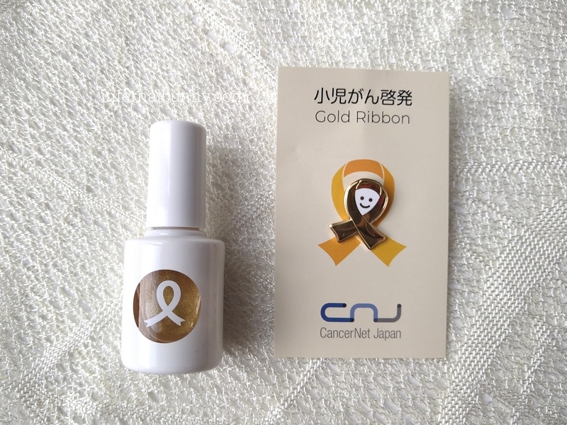 ネイルポリッシュを買うとゴールドリボンのピンバッジがついてきます。