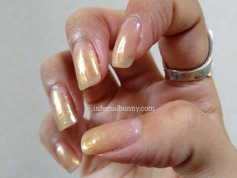 ゴールドリボンのネイルポリッシュは、ゴールドの微細なラメが配合された透明なマニキュア。ラメ密度は低くて薄づきなので、単色使いよりは重ね塗りやネイルアートに向いていると思う。