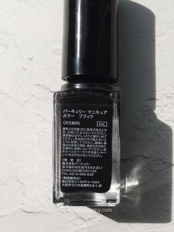 バーキュリーはマニキュアを2種類出している。一つは水やアルコールで落ちる1dayタイプの水性ネイル。過去記事で紹介した胡粉ネイルと同じような、除光液を必要としないネイルである。そしてもう一つが、今回買った除光液を必要とするタイプの一般的なネイルである。クリアカラーとブラックカラーの2色展開で、わたしはブラックを購入した。
