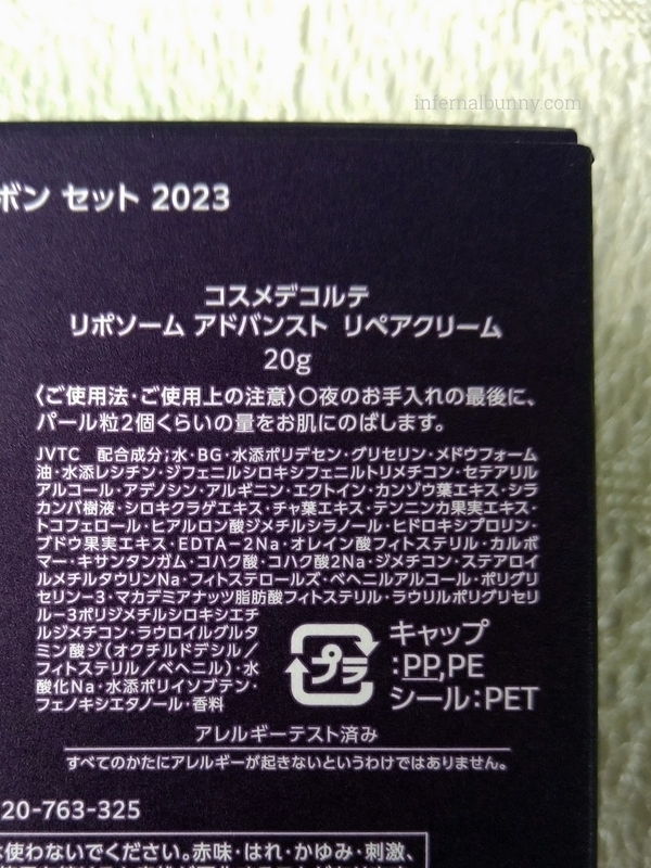 内容は、リポソームアドバンスト リペアセラム75ミリリットル、リポソームアドバンスト リペアアイセラム8ミリリットル、リポソームアドバンスト リペアクリーム20グラム。女性に対する暴力撲滅運動を象徴するパープルリボンがパッケージについた限定デザインである。リポソームアドバンスト リペアセラム単体の値段(75ミリリットル16500円)でミニサイズの目元用美容液とクリームがついてくるのでとてもお得。リポソームアドバンスト リペアセラムは公式の通称「モイスチュアリポソーム」の名で親しまれており、高級美容液の大定番なので、試してみたい人はこの機会にパープルリボンセットで買うのがおすすめだ。