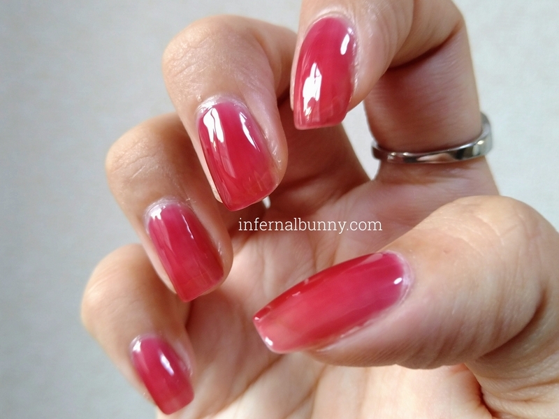 1度塗りがこちら。わたしは地爪が黄味がかっているので、サーモンピンクっぽくなる。