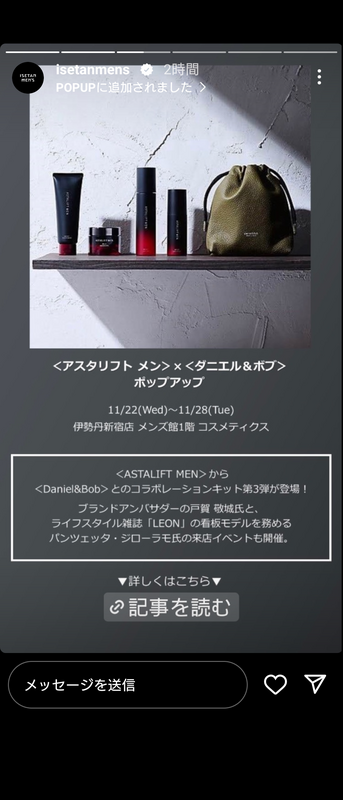 アスタリフトメンは、富士フイルムが写真フィルム分野で培ったテクノロジーを活かして開発したアスタリフトのメンズラインである。広告戦略においてはFigo同様、「男らしさ」を強調するスタイルのようだ。公式インスタグラムには、Figoと同じく高級腕時計が小道具として登場する。
