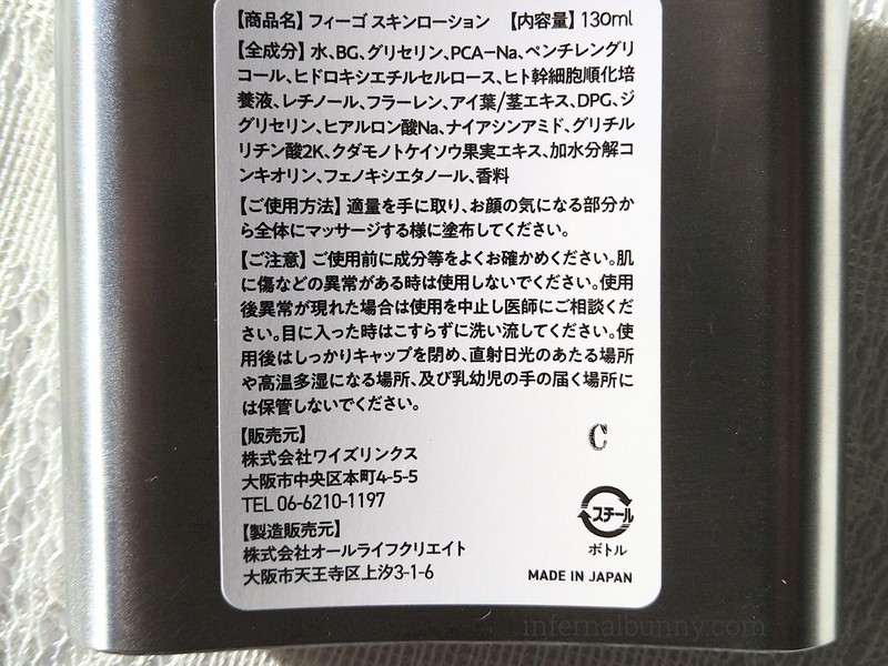 基本的に化粧品の成分は、割合が多い順に記載される(医薬部外品においてはまた別ルールがある)。なので化粧水の場合、多くの商品がまず水から始まる。公式によると、Figoのスキンローションの成分は以下の通り。