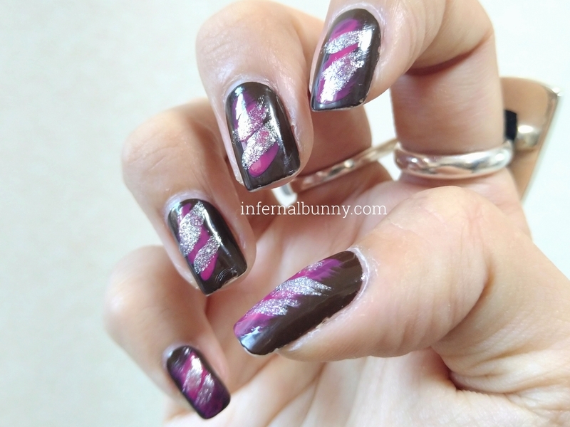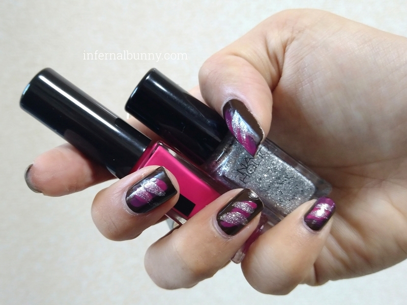 ダークブラウンはネイルズインク レッツゲットヌード バックンガムゲート。ショッキングピンクはル・ショックの記事でも使ったKATE(ケイト) ネイルエナメルカラーN PK-3。シルバーラメはネイルホリックのアート用の細筆シリーズ、ネイルホリック アート SV082。