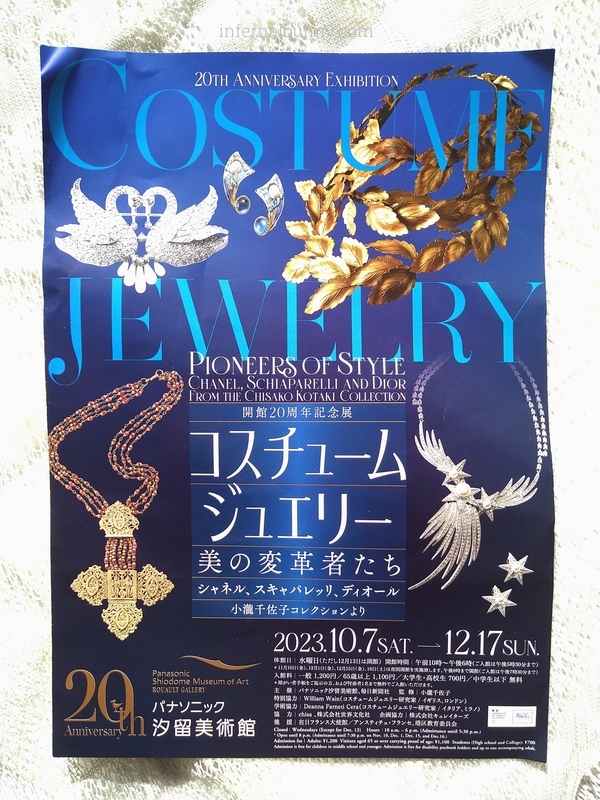 パナソニック汐留美術館の開館20周年記念展『コスチュームジュエリー 美の変革者たち シャネル、スキャパレッリ、ディオール』を観に行きました。コスチュームジュエリーとは、宝石や貴金属(ゴールド、プラチナなど)といった高価な素材に限定されず自由に素材を選定して作られるジュエリーのこと。20世紀初頭の当時、宝石や貴金属を使うファインジュエリーが富の顕示の意味合いを含んだのに対して、コスチュームジュエリーは純粋に衣服との取り合わせを優先して自由闊達にデザインされるため、パリのモード界では必要不可欠な要素となりやがてアメリカへと伝播した。今回の展示は、コスチュームジュエリーの展開を包括的に紹介する日本初の展覧会だそう。