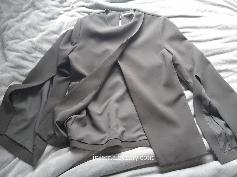 フロントと袖に大胆にスリットを施たトップスはジャケットのようなパターンを使い、肩周りやフロントにあえてかっちり感を残したモードな印象。