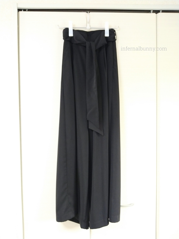 裾周りが80センチもあり、ロングスカートのように見えるワイドパンツです。レーヨン混紡でツヤがあり、エレガントな印象です。裏地はありません。綺麗目コーデにもオケージョンにも幅広く使えると思います。ベルトフープがあり、幅広の友布ベルトがついてきます。ベルトフープにべつのベルトやスカーフを通してアレンジすることもできるし、友布ベルトをべつのワンピースなどにサッシュベルトとして使ってもよさそう。ポリエステル系のテロテロワイドパンツでベルトフープがあるものは地味に珍しいのではないでしょうか。1本あったら絶対便利です。