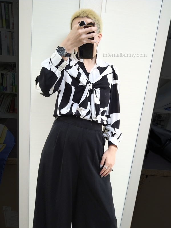 甘口派の人にも辛口派の人にも合うと思います。冬に人と会うときなど、アウターを脱いだら上半身はシンプルになりがちですが、このトップスならアウターを脱いでも素敵ですし、アウターが要らない季節に1枚で着てももちろん映えます。コーデ次第でオケージョンもいけそう。着画では、上からベルトでウエストマークしたパターンと、オケージョンを想定したパターンも撮ってみました。