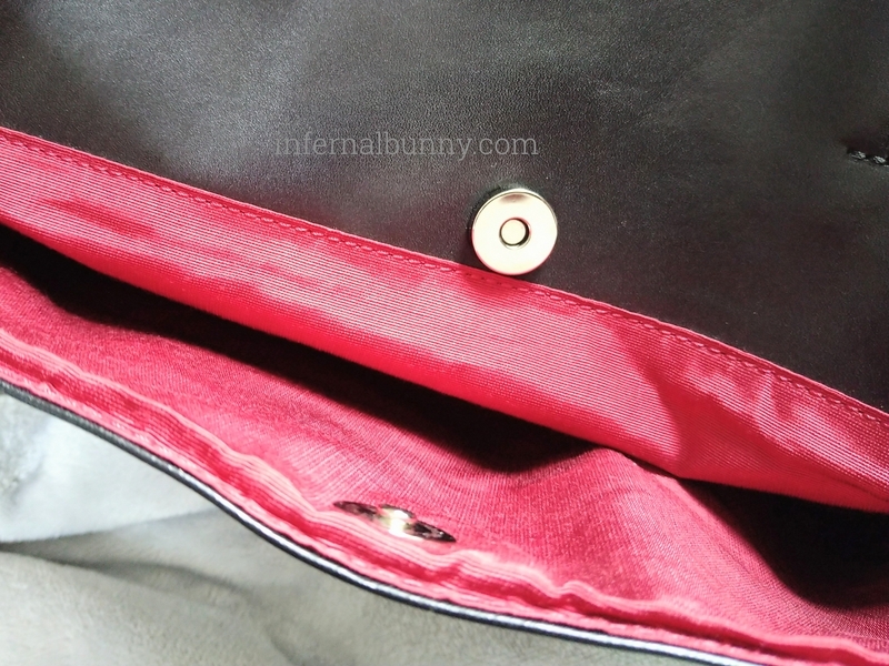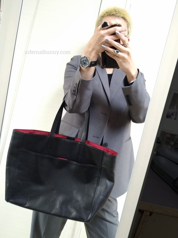 A4可で外ポケットがついていることを条件に探し出して、通勤に使っていたトートバッグです。外ポケットつきのレディーストートバッグは地味に珍しいです。内側にはベタポケット2つとチャックつきポケット1つがあり、小物の整理もばっちりです。内張りは赤色で、暗くないのでものが探しやすく実用的です。開閉はスナップボタン式、底鋲あり、ショルダーベルトなしです。公式の写真にはついている革製のブランドタグは処分したのでありません。