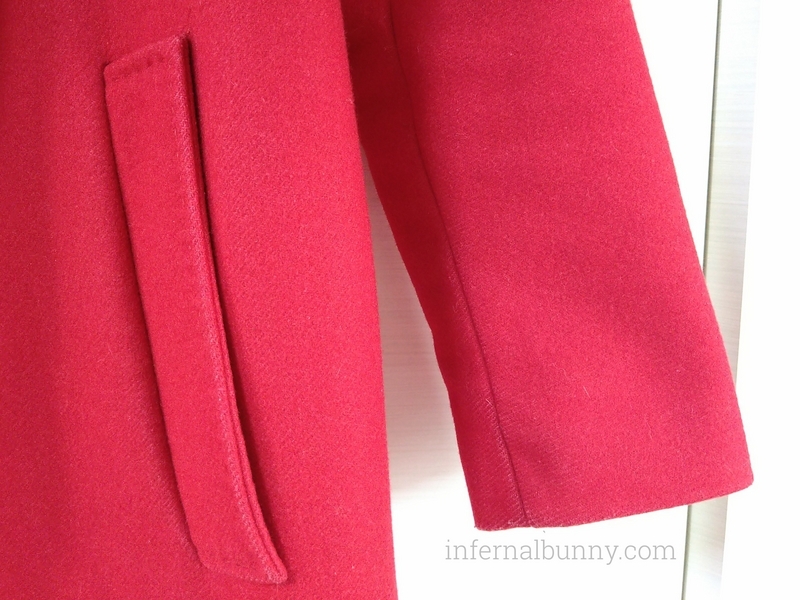 ZARAの真っ赤なチェスターコートです。赤色の色味はできるだけ肉眼に近いように撮影してあります。