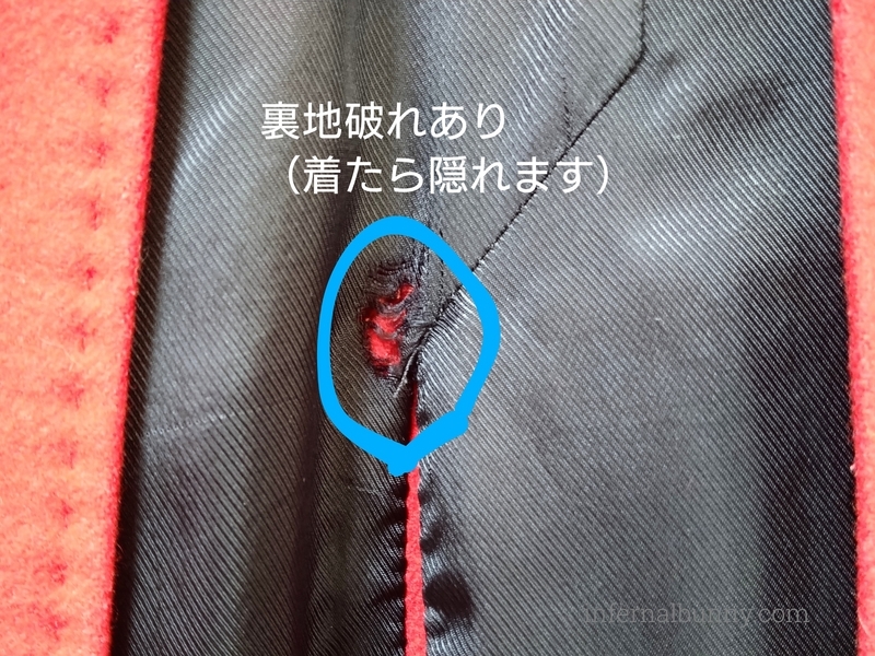 傷みとしては、生地同士が擦れて白っぽく退色した部分がいくつかあります。よく見ないとわからない程度だとは思います。また、裾スリットの裏地が少し破れています(着ると隠れます)。写真をご確認ください。購入後7、8年経っているにしては悪くないと思います。