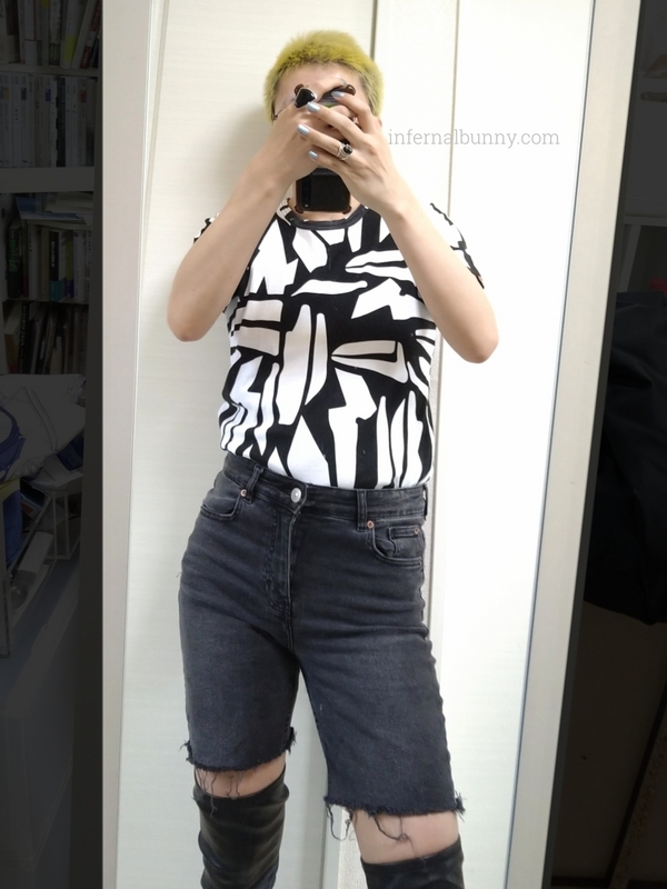 珍しくライトブルーのデニムです。先述したように、ボトムスは万が一の経血染みを警戒して基本的に濃色しか買わないようにしているのだが、タダみたいな値段なのでつい買ってしまった。雑な買い物だったが、わたしの体型に合っていたようで、入っていたころは腰回りのシルエットが綺麗に見えて重宝していた。プチプラブランドのスキニーには珍しく綿の配合率が高くて生地がしっかりしているのもいい。思いがけないめっけもんだった。