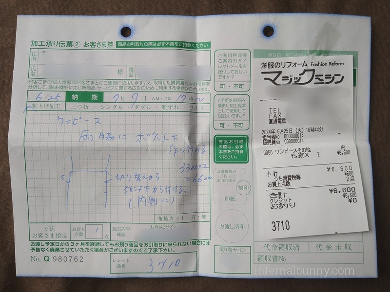 全国に400店舗超を展開する大手チェーンで、衣料品を持ち込むと裾上げやウエスト調節、パーツ交換、ボタンつけなど一般的な修理・調整から、別アイテムに作り替えるような大がかりなリフォームまでやってくれます。ホームページに掲載されている主要サービス一覧にはポケット追加はありませんが、請け負ってくれたという口コミを読んだので、今回初めて持ち込んでみた次第です。