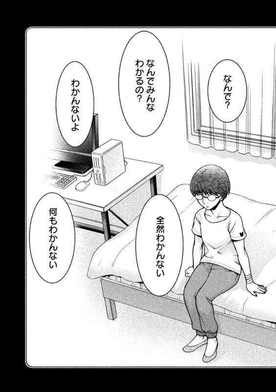 一方で、ワンルームで同居しているとマスターベーションがしにくいことについて語り合う場面もあり、性の問題は、人と人の共同生活に伴う課題の一つとしてフラットに登場する。不自然に隠蔽されているわけではない。その上で二人は、少しずつ性的な親密さも深めていくのである。ここでも、ステレオタイプな男らしさ・女らしさを踏襲した都合のいい展開にはならない。二人は、そうしなければ生きられなかったから「らしさ」に拠らない人間関係を築いているのであり、まず大きくは定型発達の作法から外れているのだが、男女のステレオタイプからも必然的に外れていく。