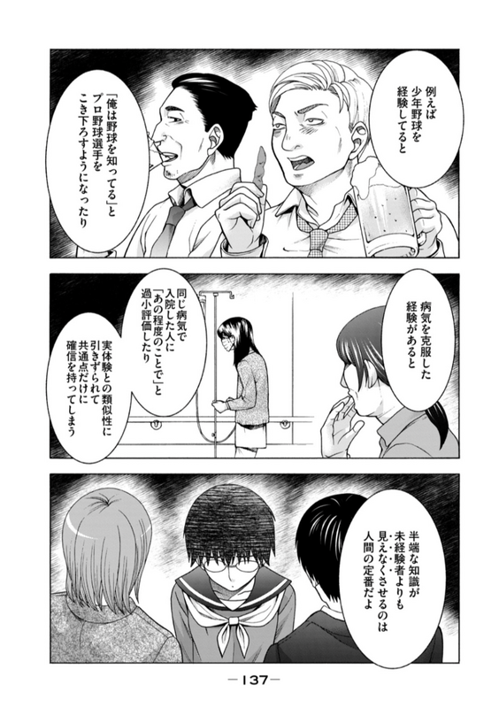 生そのものの瀬戸際まで追い詰められている斉藤さんを前に、横井は常に決断をし最善を選択する必要があるが、その選択が真に最も善きものだったかの正解はどこにもない。この「行けども行けども手探り、すべてが不確か」な状態の苦痛はまさに、発達障害という、明確な治療法がない特性の生きづらさそのものと響きあう。横井は、達成感というモチベーションがほとんど得られないまま、それでも日々決断という莫大な思考コストを払い続けなければならない。しかも、「不正解」を選択してしまったら、たった一つの言動が斉藤さんを深く傷つけ、関係が破綻する可能性は常にある。彼女はそれくらいぎりぎりの状態であるとして描写されている。実際作中では、横井の言動が元で斉藤さんが自傷行為に至る展開がある。