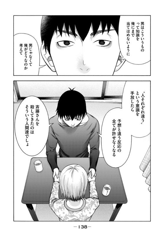 永山がそうであるように、斉藤さんもまた、一般的青少年ではまったくない、特異的な個人である。まったくもって可愛らしくはない、そばにいてほしくない、トラブルに満ちた発達障害者である。差別的構造によって社会的諸関係が解体されていく寄る辺なさを、永山は他傷として発露し、4人を殺害した。似た空漠を、斉藤さんもまた、殺人とまではいかないまでも世間一般的には受け入れられることのない非道徳的な方法で発露している。彼女はネットストーキングによって横井の家を突き止めていきなり押しかける。これは横井が女性漫画家で斉藤さんが男性ファンだったら即刻通報されても仕方がないほどの逸脱行為である。横井の家に押しかけた上で半ば強引に宿泊し、その日のうちにリストカットをするのも、これまたとんでもなく迷惑だ。犬を蹴るのも、銭湯で幼子と母親に手を上げるのも、横井のファンに嫉妬して掲示板を荒らすのも、激昂すると横井すら殴打するのも、決して社会的に容認されることはない行為である。しかしそれらの加害的で非難に値する言動の裏には必ず、彼女なりの必然性がある。彼女にそうさせた切実な理がある。根源的には、それ自体はただの現象に過ぎない発達凸凹を障害たらしめる社会構造がある。単純なわがまま、悪意、我慢不足、怠惰、自己責任に回収されるべきではないそれらを、横井は一つ一つ拾い上げる。『アスペル・カノジョ』序盤のクライマックスの一つを担うのは、第2巻第12話「見えてるつもり」における横井の「俺には見えてる」というシンプルな台詞である。横井は斉藤さんを見ている。行動自体の善悪をジャッジして叱責することよりも、背後にある彼女なりの理を探すことを優先して、斉藤さんを観察している。観察し、対話し、受容する。横井の中に、斉藤さんの居場所を作る。他者に受容される経験の地道な積み重ねが、斉藤さんの輪郭となり足場となり、彼女は次第に本来あるはずの精神的安定を取り戻していく。平穏とは、持続的であることだ。持続的でないものには、いかなる安心も生じない。本作が浮き彫りにするのは、そんな普遍的な真理である。『アスペル・カノジョ』はつまるところ、人間と人間の物語であり、この世に人間ある限り普遍的な輝きを放つだろう。