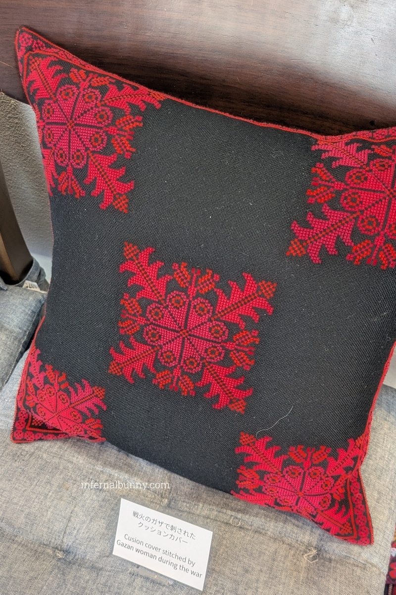 パレスチナ刺繍はパレスチナの人々の文化的アイデンティティの象徴であり、難民や農村の女性にとっては現金収入を得る貴重な手段である。第一次中東戦争(1948年)以降はとりわけ、レジリエンスの証でもある。2023年10月以降も製作は続けられており、会場には戦火のガザで刺されたクッションカバーの展示もあった。
