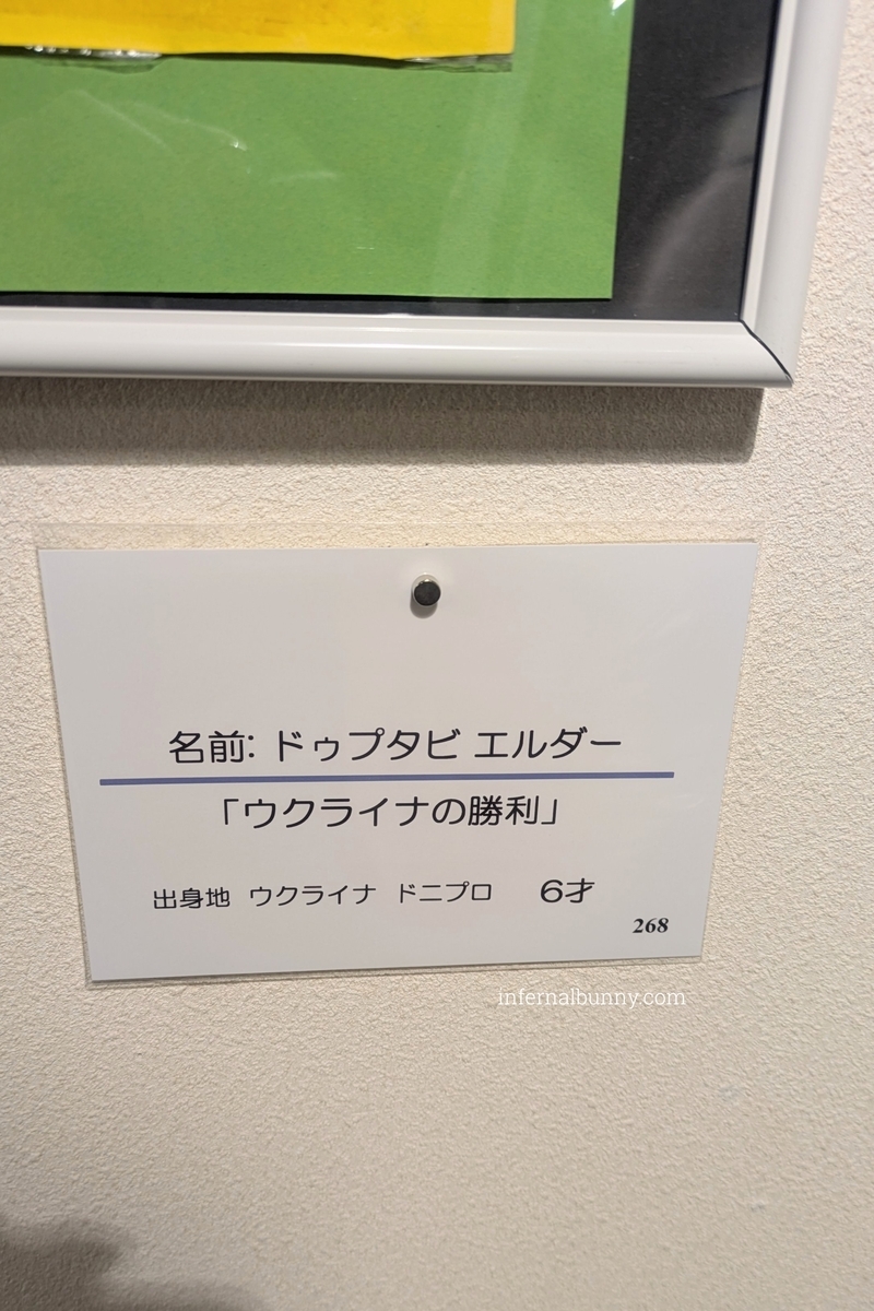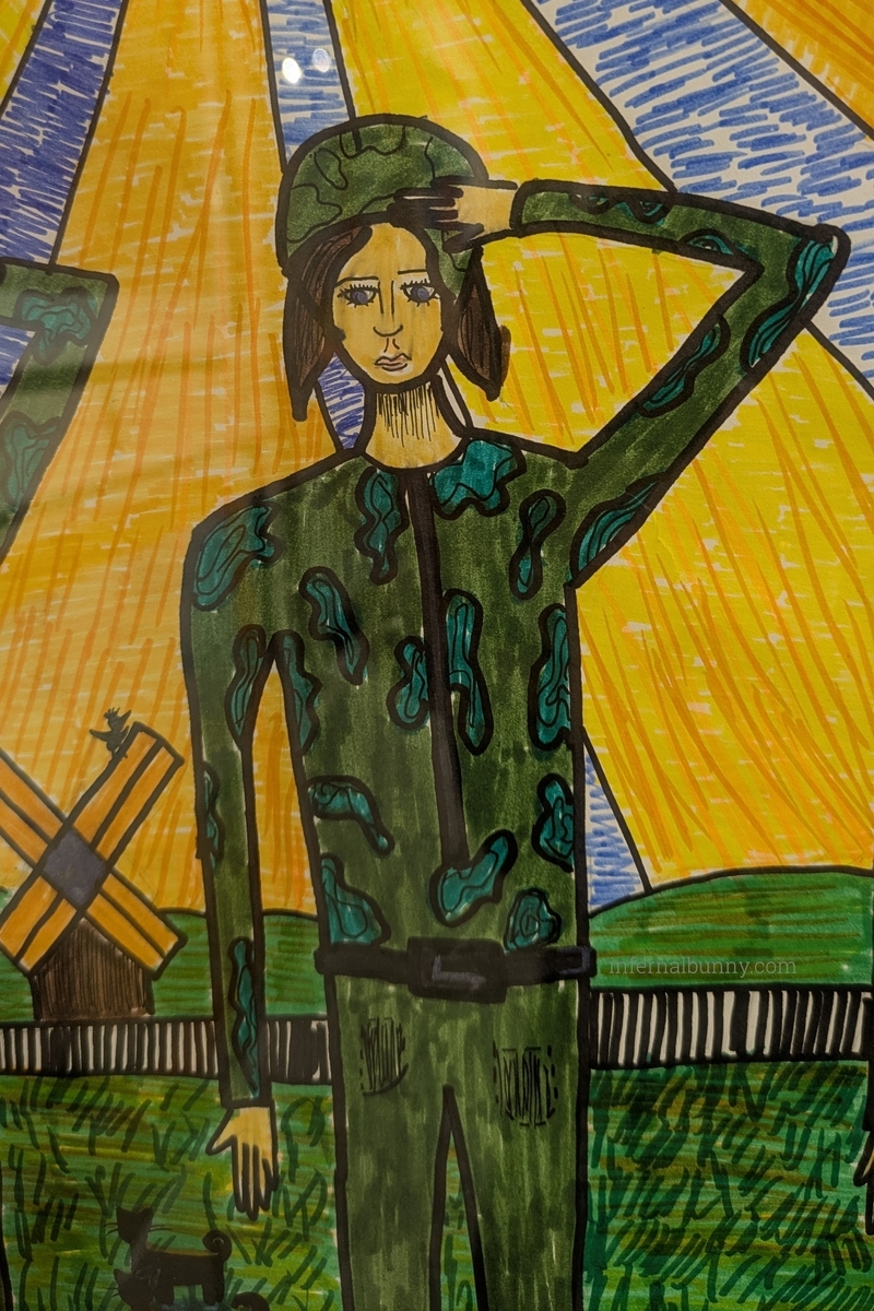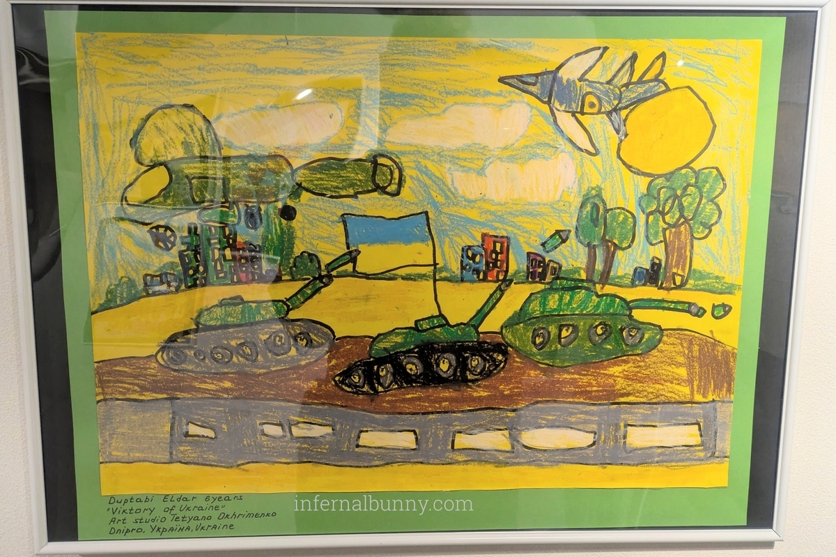 一般的な児童の絵画展と違うのは、軍人や戦車や国威発揚的モチーフが自然に織り込まれていることで、子どもたちが戦争のある日常を生きていることが重く伝わってきた。女性兵士と思しき絵があるのは、今や世界有数の女性兵士割合を誇るウクライナならではだろう。
